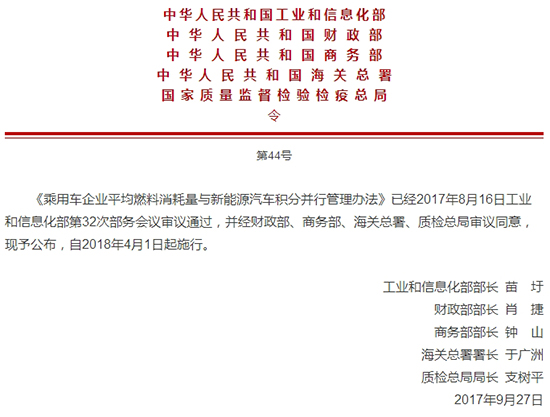 备受瞩目的“双积分”政策终于落地。昨日(9月28日),工业和信息化部、财政部、商务部、海关总署、质检总局联合公布了《乘用车企业平均燃料消耗量与新能源汽车积分并行管理办法》。