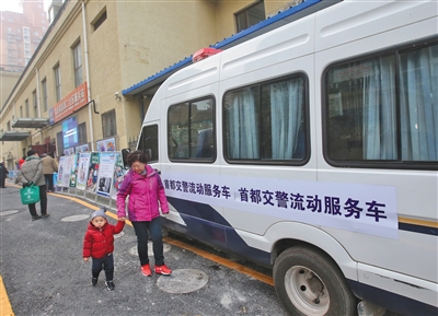 昨日,首批“首都交警流动服务车”来到朝阳弘善社区,现场为社区居民提供车驾管业务服务。新京报记者 王贵彬 摄