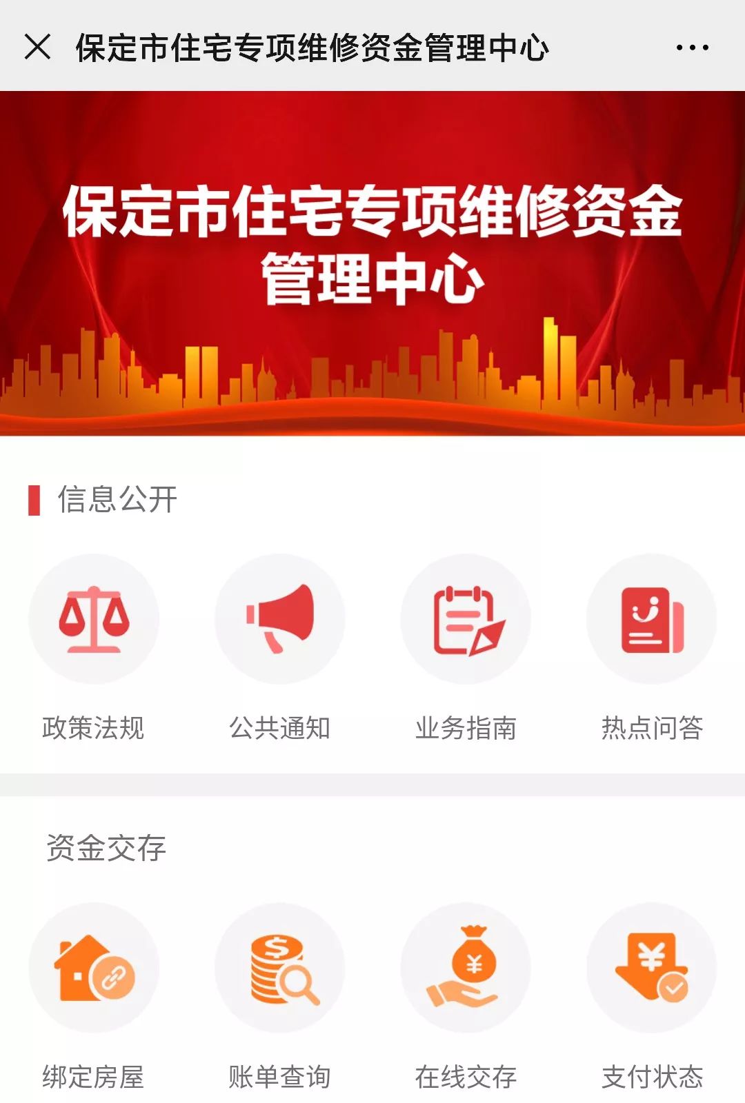 记者微信公众号搜索“保定市专项维修资金管理中心”,打开后关注,进入会话页面,点击下方“特色服务”可进入业务系统主页面,“资金交存”一项清晰可见。