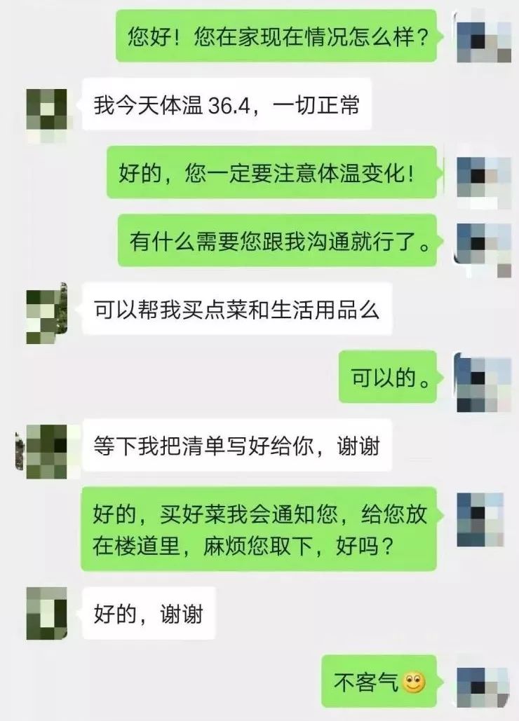 每天早上佳恒物业的客服们在微信群中收集业主的采买信息,汇总清单后前往小区附近的大型超市为业主采买物资。将所有业主采购清单上的物品买好后,为了减少与业主的近距离接触,都是将物品放在业主家门口,通过微信告知业主后就尽快离开,实现“无接触交货”。