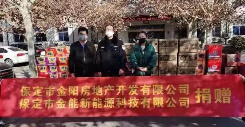 2月4日,保定市金阳房地产、金能新能源科技公司将价值六万元的消毒和防护用品以及食品等物资,分别送到莲池区公安局、焦庄乡政府、五尧乡政府、五尧乡派出所等单位,为一直奋战在防控疫情一线的工作人员送上一份关心慰问。
