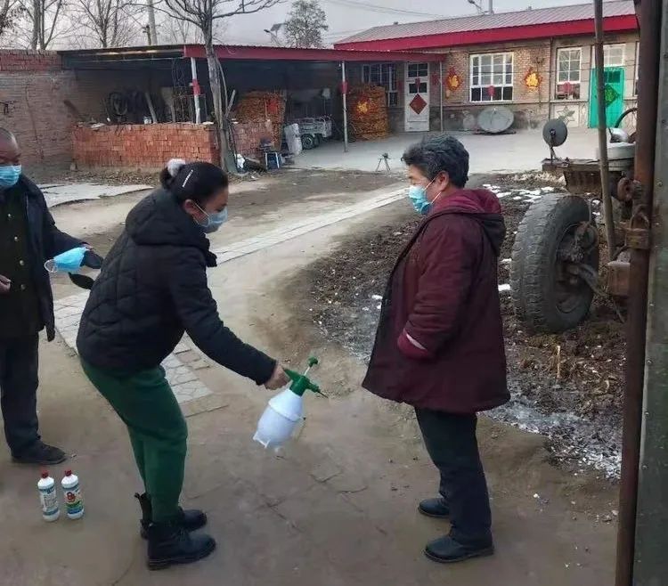 村支部书记、村主任张俊为建档立卡户送去口罩和消毒液,并耐心讲解使用方法