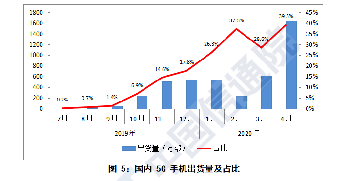 报告显示,4月国内市场5G手机出货量1638.2万部,占同期手机出货量的39.3%;上市新机型22款,占同期手机上市新机型数量的45.8%。2020年前4个月,国内市场5G手机累计出货量3044.1万部、上市新机型累计65款,占比分别为33.6%和47.4%。