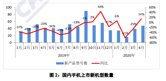 在疫情期间,各手机厂商纷纷开始利用线上直播的方式发布全新5G手机。第二季度开端,在疫情没有正式结束之前,各厂商延续了线上发布新款旗舰的策略,数据显示,4月国内手机上市新机型48款,同比增长14.3%。同样受困于第一季度销售下滑,截至4月,2020年共上市新机型累计137款,同比下降18.0%。