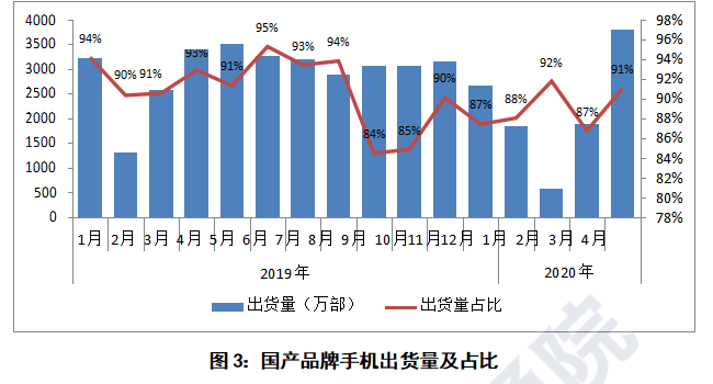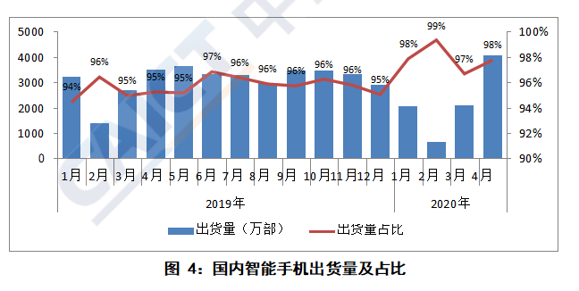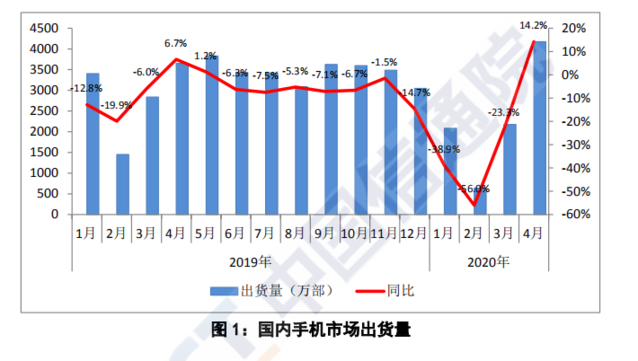 5月12日,中国信息通信研究院发布了《2020年4月国内手机市场运行分析报告》(以下简称报告),报告指出,2020年4月,国内手机市场总体出货量4172.8万部,同比增长14.2%;1-4月,国内手机市场总体出货量累计9068.1万部,同比下降20.1%。数据显示,4月份疫情对手机市场的影响正在降低。