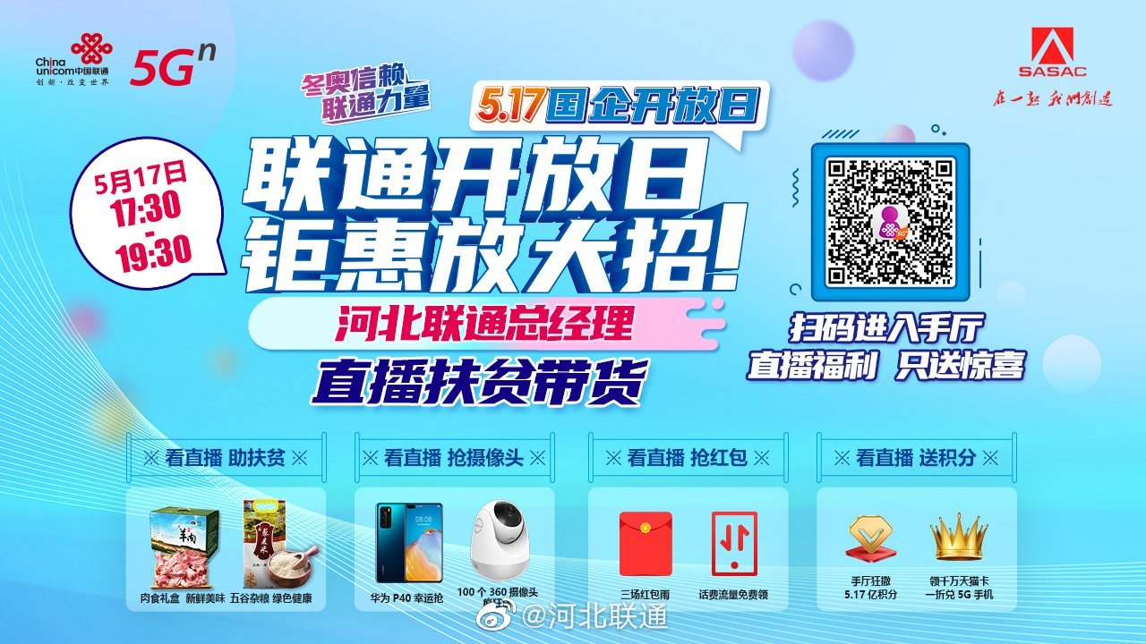 据悉,此次直播卖的全是精挑细选的扶贫产品,同时还有超多福利送出:看直播可以抢红包,三场红包雨,话费流量免费领等;直播现场购扶贫产品可获赠实物礼品;直播互动还有5.17亿积分送,领千万天猫卡一折兑换5G手机……5月17日17:30至19:30,欢迎您关注联通手厅APP直播专区,打开联通手机营业厅APP,点击“服务-生活-直播LIVE”即可围观参与。