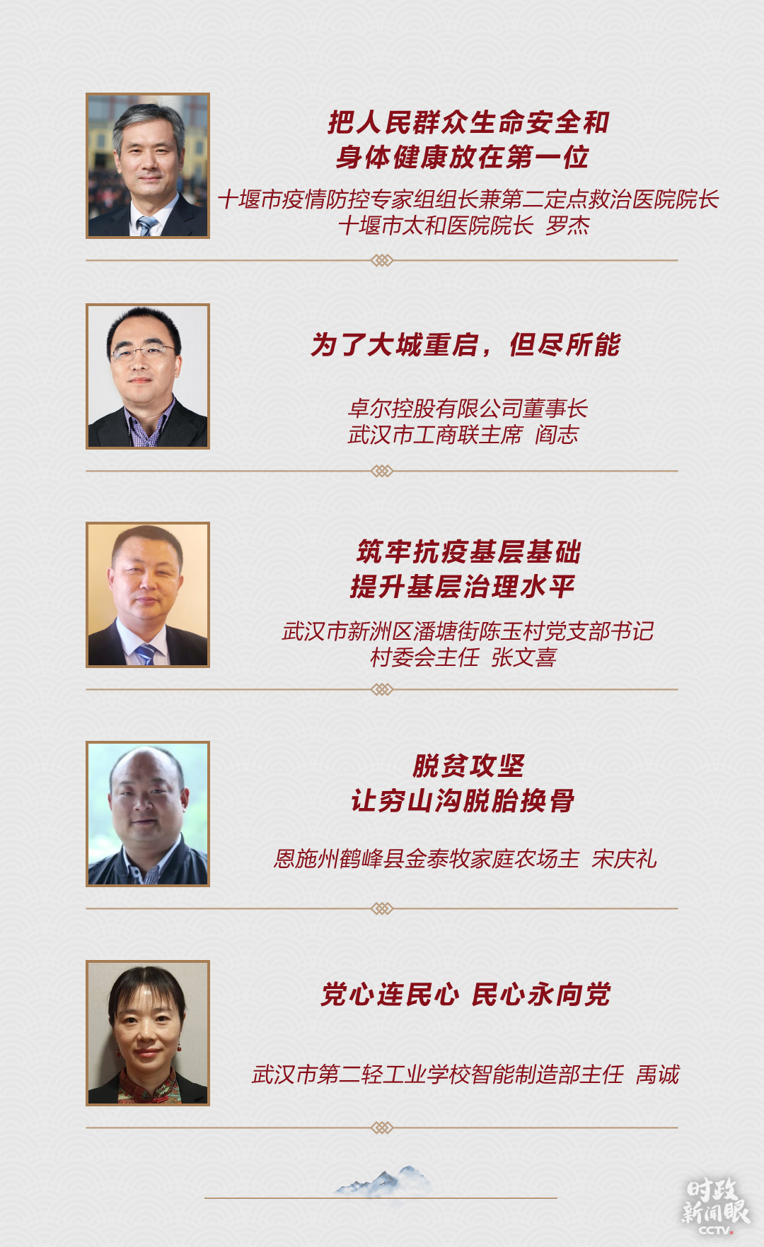 和前两场“下团组”活动一样,湖北代表团有5位代表面对总书记发言。第一个发言的是湖北省十堰市太和医院党委书记、院长罗杰代表。巧的是,今年两会期间,第一位在“代表通道”接受记者采访的也是罗杰。