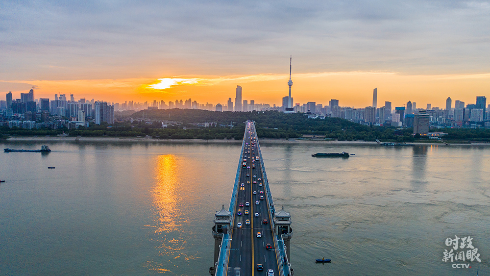 △21日傍晚,武汉晚霞染红天际,长江大桥上川流不息。