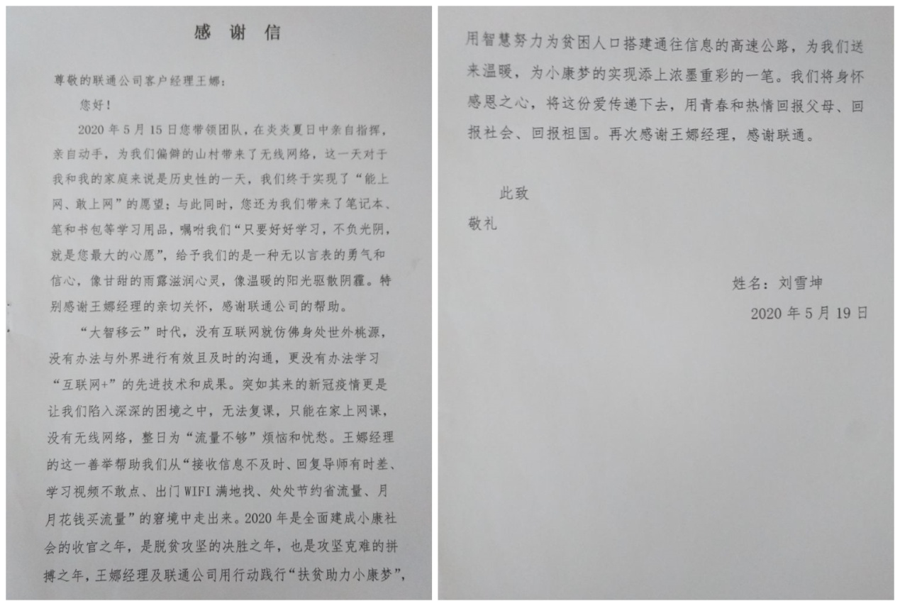 5月25日,保定曲阳县分公司收到一份来自南雅握中学的扶贫助学报告和一封来自建档立卡贫困生刘雪坤的感谢信,感谢保定联通政企中心教育行业客户经理王娜精准扶贫、攻坚克难帮助贫困生解决上网课问题。