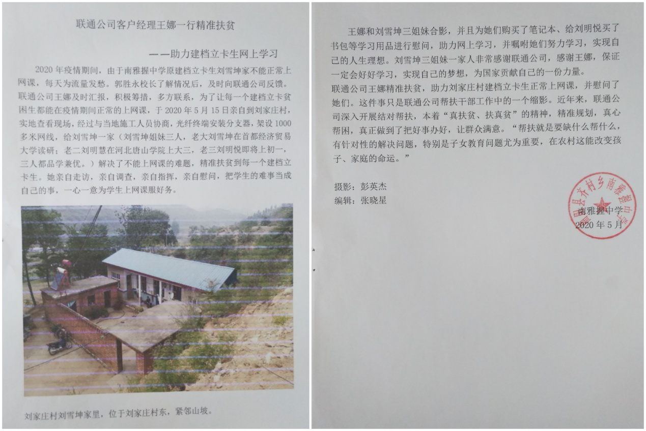 “近年来,联通公司深入开展结对帮扶,本着‘真扶贫、扶真贫’的精神,精准规划,真心帮困,真正做到了把好事办好,让群众满意。”“她亲自走访、亲自调查、亲自指挥、亲自慰问,把学生的难事当成自己的事,一心一意为学生上网课服好务。”南雅握中学在报告中高度赞扬了联通公司和王娜。