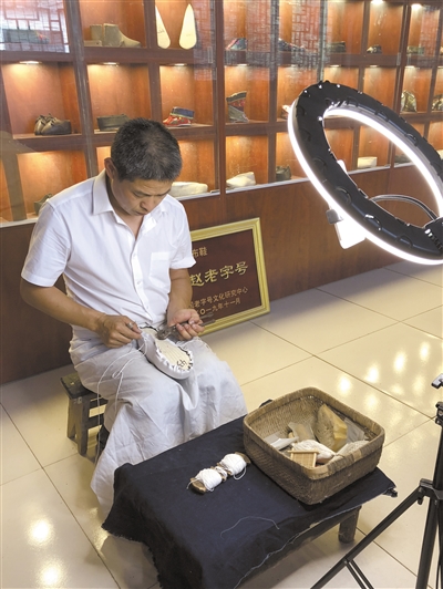 6月6日,河北省级非物质文化遗产“宫廷布鞋制作技艺”第四代传人刘五代在直播中现场演示绱鞋技艺。