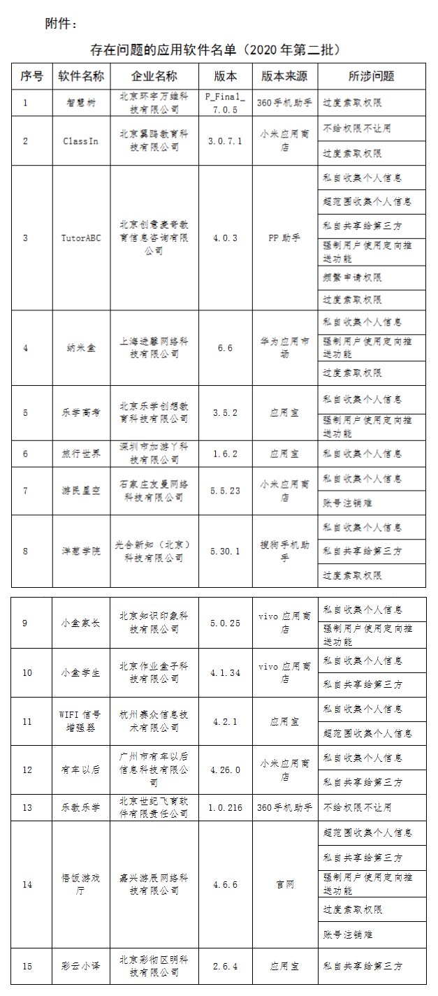 记者3日从工业和信息化部官网获悉,工信部信息通信管理局公布《关于侵害用户权益行为的APP通报(2020年第二批)》显示,依据《网络安全法》《电信条例》《电信和互联网用户个人信息保护规定》等法律法规,工信部近期组织第三方检测机构对手机应用软件进行检查,对发现存在问题的企业进行督促整改。截至目前尚有15款APP未完成整改,其中“智慧树”“乐学高考”“旅行世界”等APP在列。