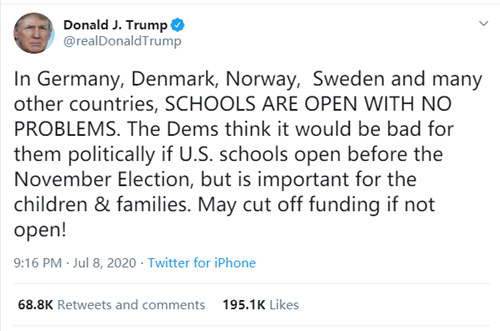 连日来,白宫持续对全美大中小学施压,要求这些学校必须在今年秋季学期全面复课。当地时间7月8日,美国总统特朗普在社交网络上发文称,若美国学校在今年秋季仍拒绝开学复课,他将削减对这些学校的联邦教育拨款。消息一出,立刻成为全美各大媒体头条,并引发强烈反弹。继推出针对国际留学生的签证新规后又向全美学校发出新威胁,意味着白宫点燃的这把复课“战火”已经从国际留学生延烧至美国本土学生身上。