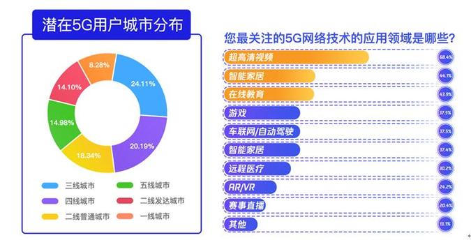 目前使用4G网络的用户中,超过8成用户计划在未来两年内尝试更换使用5G,这部分人群主要集中在我国三四线城市。这部分潜在用户主要关注的是5G在高清视频、智能家居、在线教育、游戏、自动驾驶、远程医疗等新文创和产业互联网领域的应用。