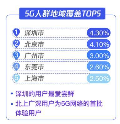 根据调研,在全国所有城市中,深圳的5G用户占比位居第一,东莞也跻身5G用户所在地域的Top5行列。深圳和东莞作为中国高科技产业的聚集地,产业创新与制造基础完备、年轻人聚集效应明显,对于新技术有着强烈的体验意愿。得益于新基建等高新技术快速发展,这些地区的5G普及率较其他地区更高。