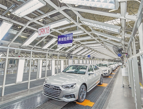 8月10日,在一汽大众长春基地总装车间,装配好的车辆接受淋雨测试。 新华社记者 张 楠摄