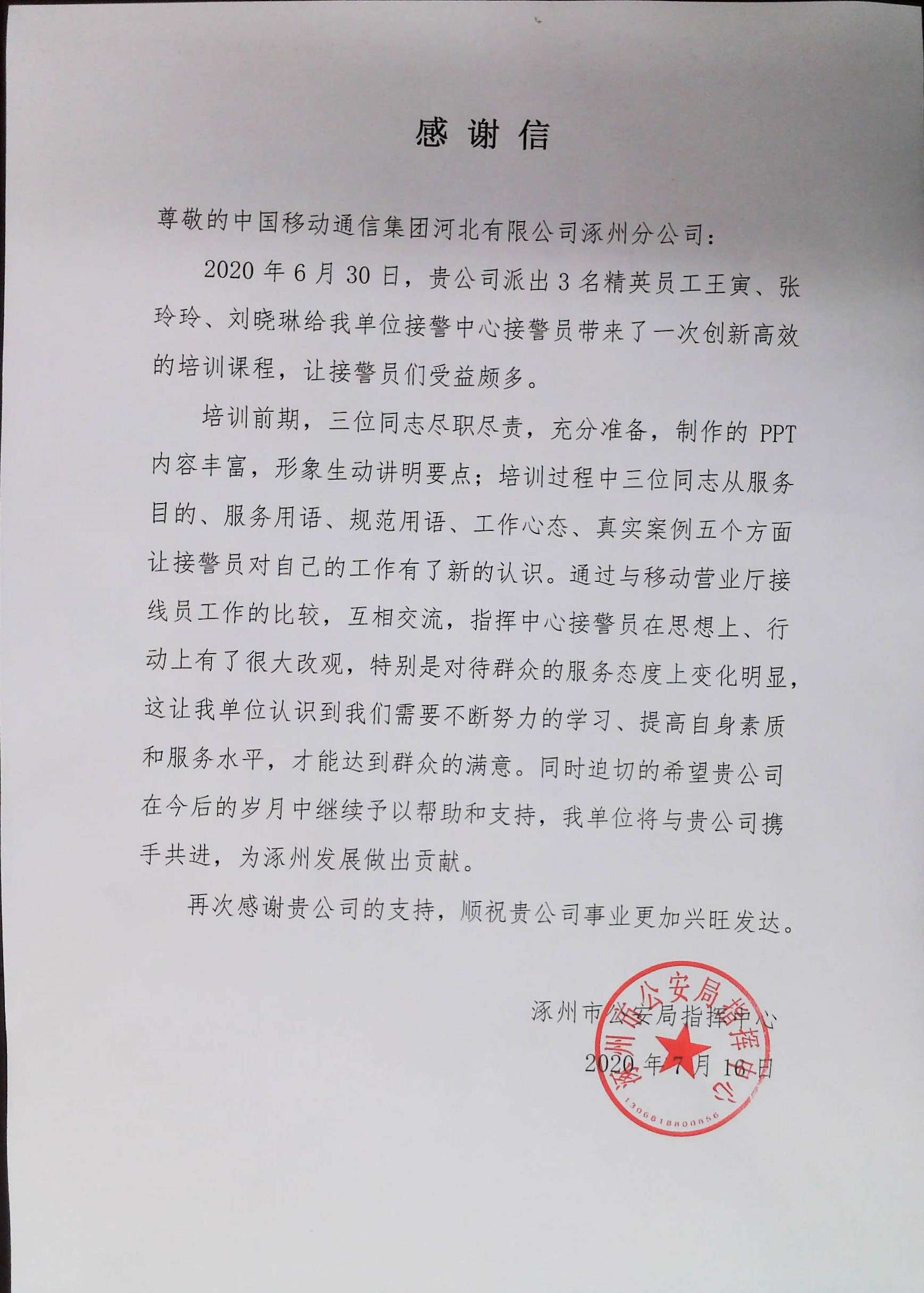 8月14日,保定移动涿州分公司收到涿州市公安局发来的感谢信,对涿州分公司为110接警中心警员进行服务礼仪培训表示感谢。