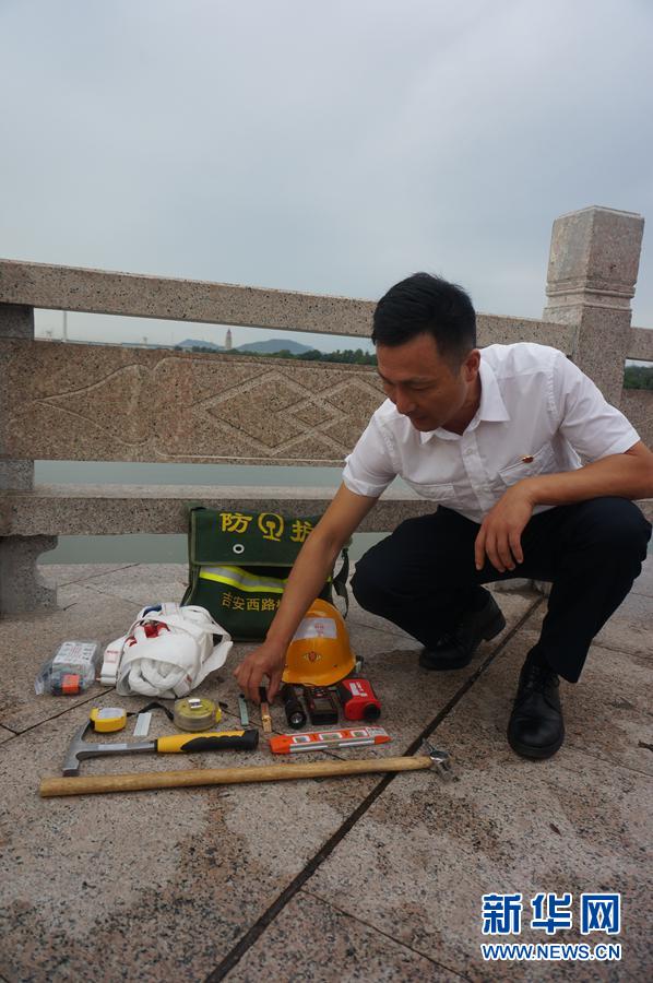 8月19日,路桥专业工程师张宏斌介绍工具袋里的检修工具。新华网记者刘琼 摄