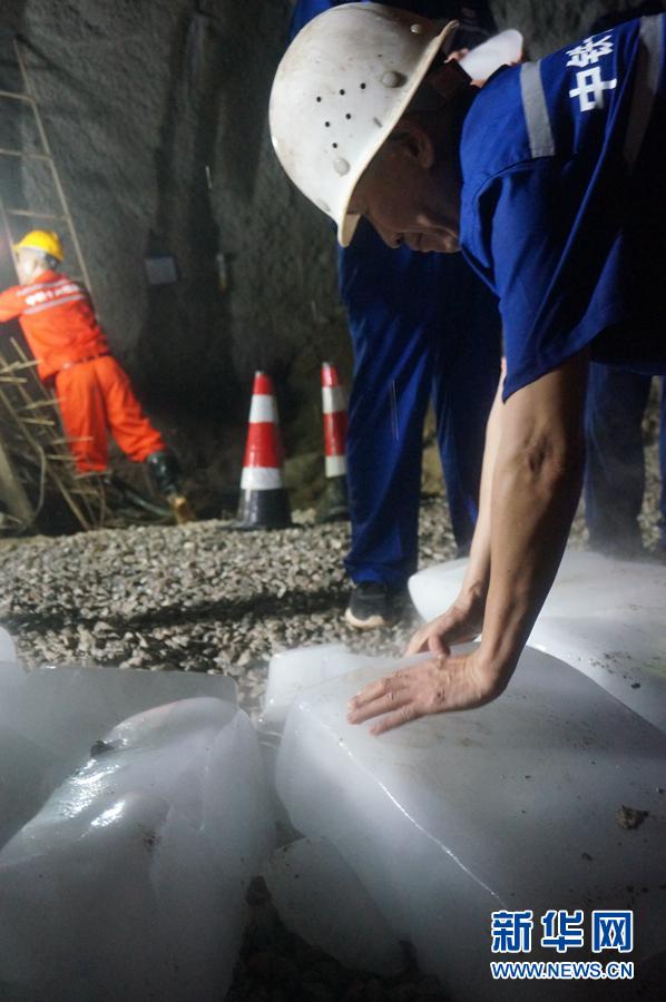 隧道内的温度高达40摄氏度,结束作业的工人在用冰块降温。新华网记者刘琼 摄