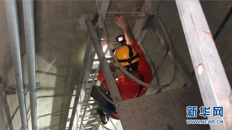 8月12日凌晨两点,赣州工务段赣州高铁路桥工区工长宁建平攀登检查梯,检查桥塔斜拉索上部钢锚箱内设备状态。南昌铁路局供图