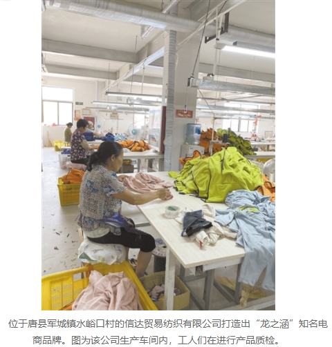 河北唐县信达贸易有限公司旗下的“龙之涵”品牌,主营婴幼儿床上用品,拥有天猫、淘宝、京东、1号店等13家网络店铺,连续3年在天猫同类目下销售稳居前三名,曾荣获“河北省著名商标”。2011年,唐县信达公司在唐县水峪口村建起了工厂。