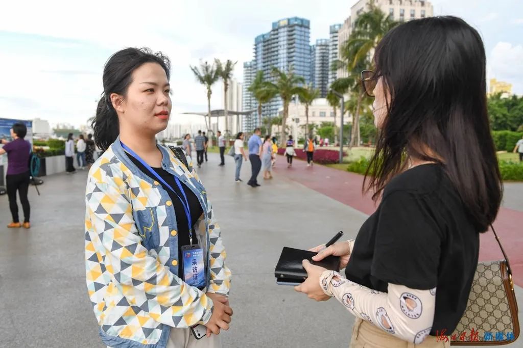 采访团成员在海口复兴城采访外籍员工。海口日报记者 王程龙 摄