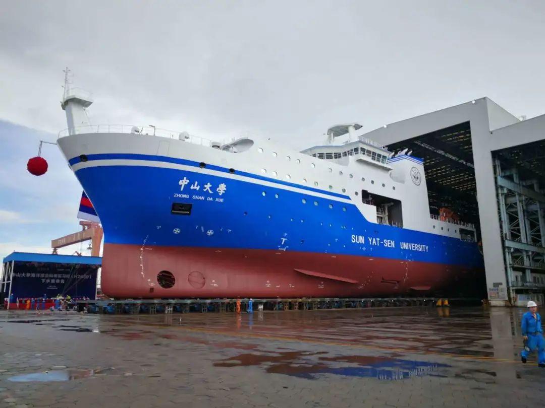 2016年6月教育部批复同意中山大学在“十三五”期间新建一艘6000吨级的海洋综合科考实习船。该船于2019年10月28日正式开工建造。此次下水后将立即开展舾装调试,预计2021年上半年交付使用。