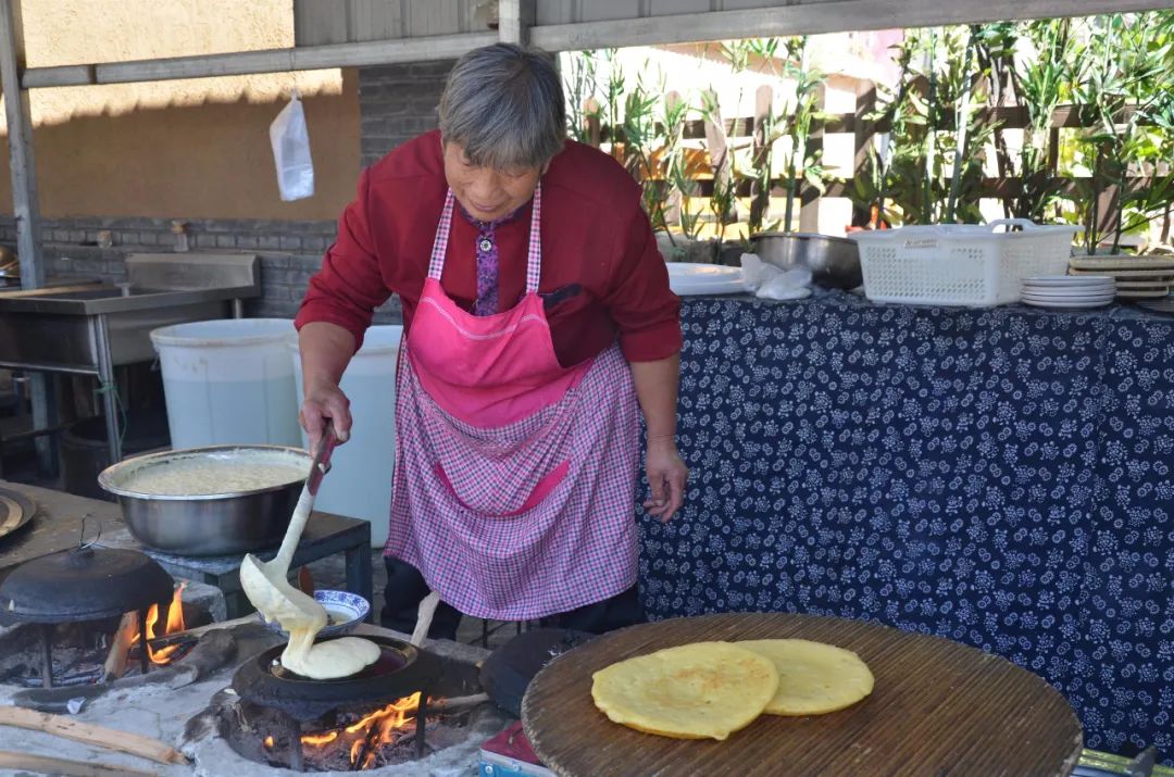 把面糊倒进平底锅、成型后翻个儿……16日中午,骆驼湾村村民唐荣美熟练地做着当地特色美食摊黄子。几分钟时间,香味弥漫开来,新出炉的摊黄子趁热送到了游客身旁。