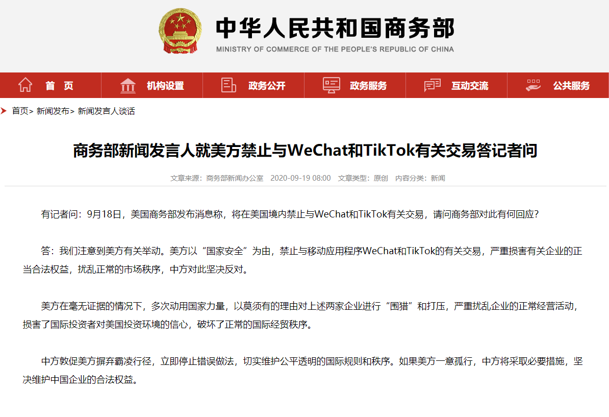 有记者问:9月18日,美国商务部发布消息称,将在美国境内禁止与WeChat和TikTok有关交易,请问商务部对此有何回应?