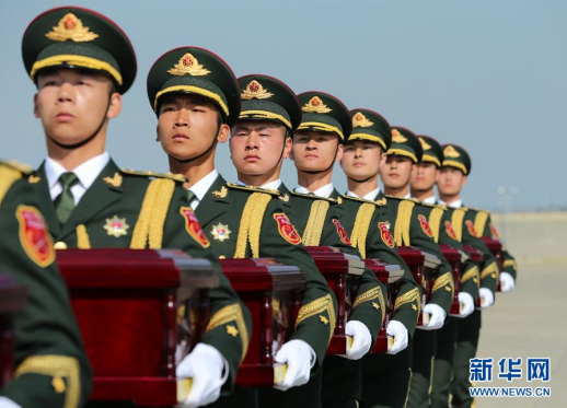 (资料图:2019年4月3日,在韩国仁川国际机场,中方礼兵护送志愿军烈士遗骸上飞机。 新华社记者 王婧嫱 摄)