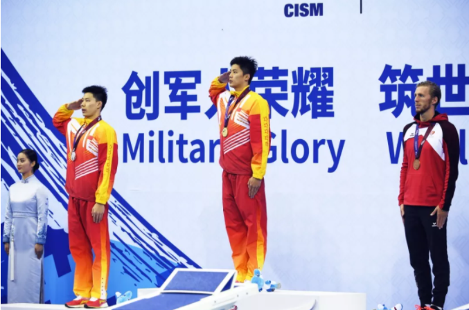 下图:2019年,世界军人运动会。在男子200米个人混合泳决赛中,中国选手获得金牌、银牌。