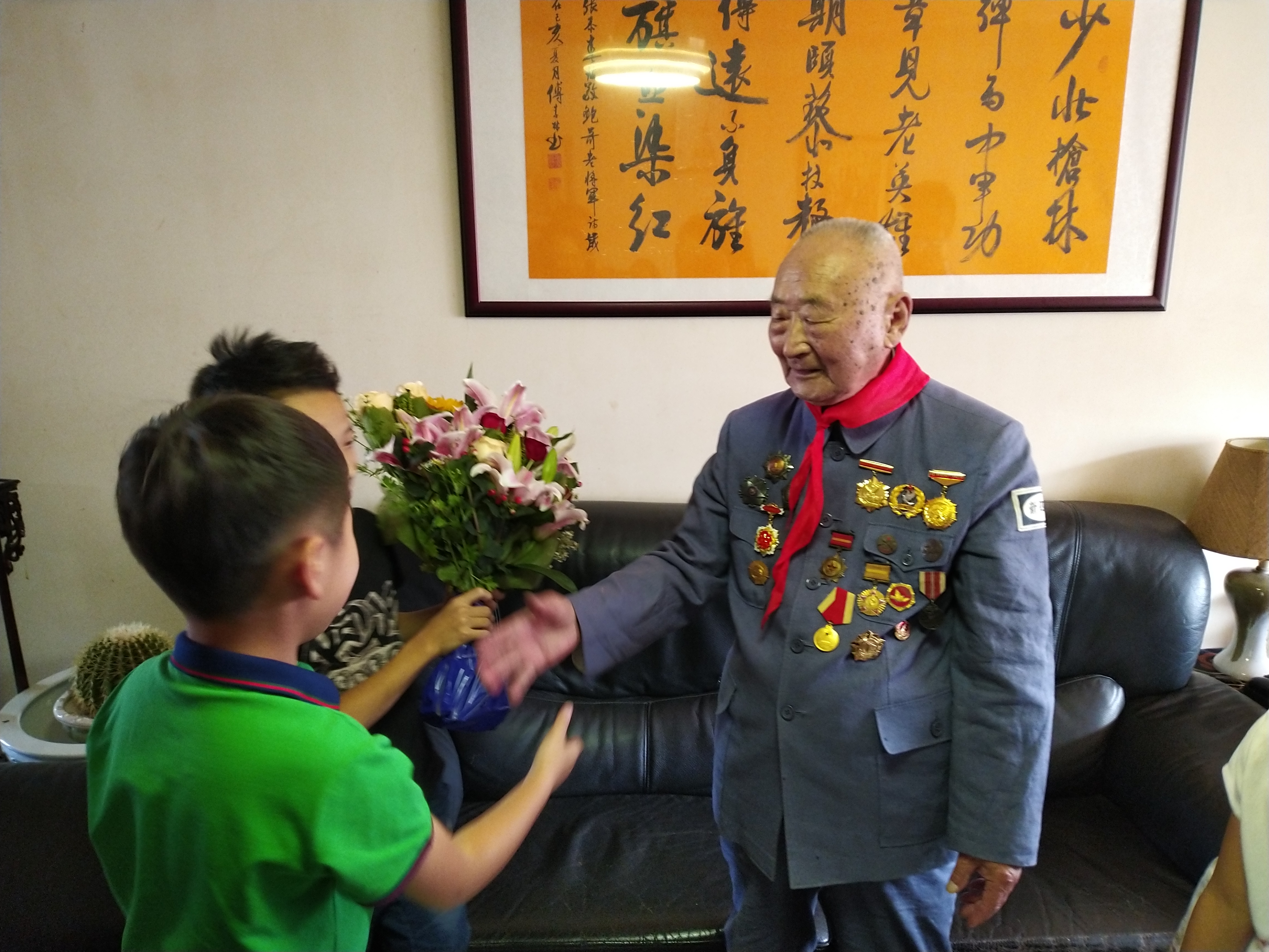 重孙给老人戴红领巾。龙钢摄