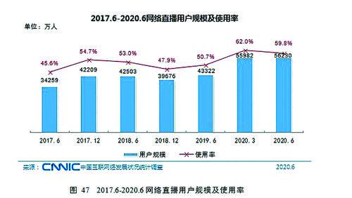《报告》数据显示,截至2020年6月,中国网络直播用户规模达5.62亿,较2020年3月增长248万,占网民整体的59.8%。其中,电商直播用户规模为3.09亿,较2020年3月增长4430万,占网民整体的32.9%。