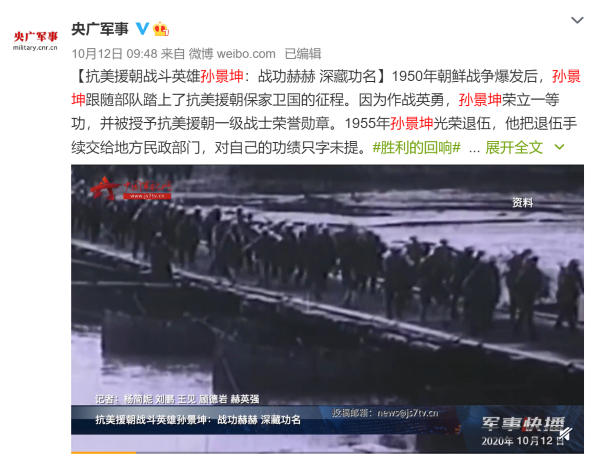 央广网10月14日消息(翁倩悦)1950年,孙景坤参加抗美援朝战争。在一次战斗中,孙景坤一人就击毙了21人。因作战英勇,孙景坤荣立一等功。回到家乡后的几十年里,孙景坤从未提起自己的功绩。他深藏功名解甲归田,带领村民改变家乡贫困面貌。女儿曾问他,为什么不讲战争年代的事?他的回答令人想哭……他说: “一个个熟悉的脸庞都倒下了,不愿说,心里难受”。他就是96岁志愿军老战士,孙景坤。