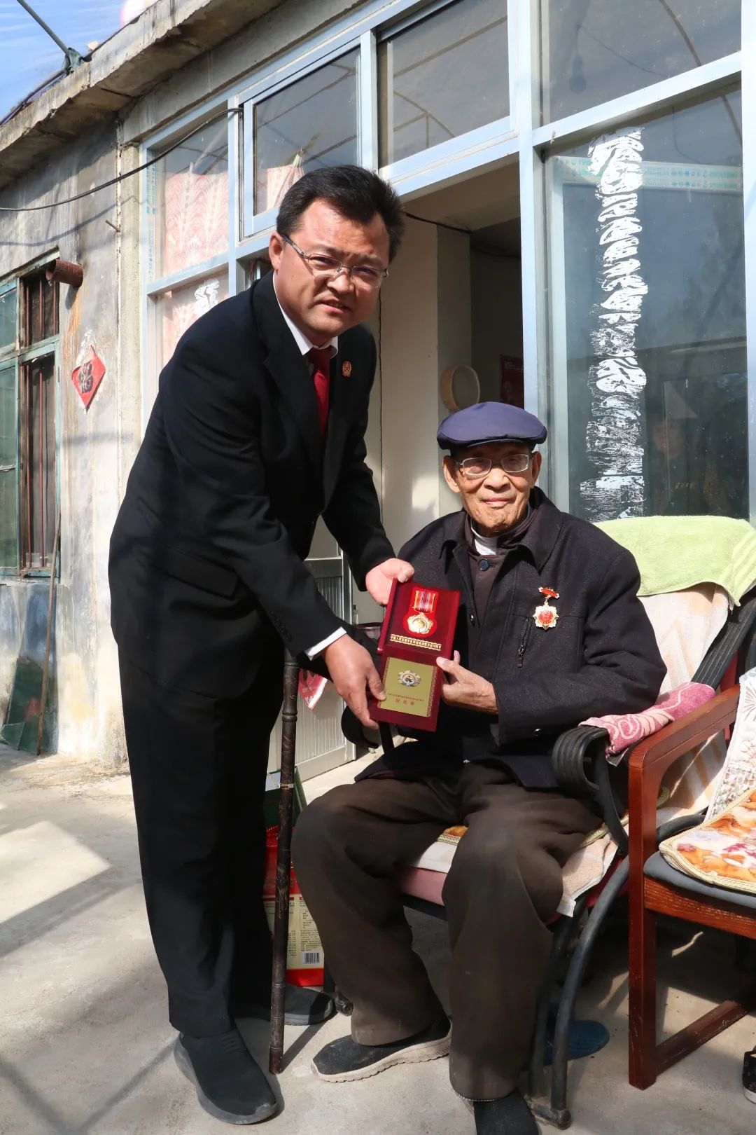 在这个特殊的日子,山东省日照市东港区人民法院一行五人,来到后村镇马家岭村,看望一位有着“特殊”身份的法院同事——离休法官、抗美援朝英雄王平堂,并代表党和政府为其颁发“中国人民志愿军抗美援朝出国作战70周年纪念章”。