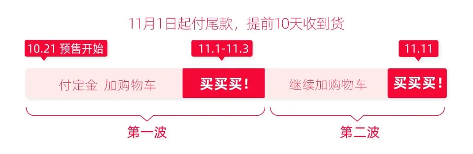 例如天猫提出此次双11活动预售10月21日开启,而且不只在11月11日一天爆发。消费者可分两波购买,11月1日-3日是第一波,11月11日为第二波。