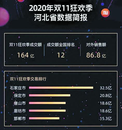 据天猫统计,截至11月11日23:59:59,中国各省购买金额增速前十榜单分别是:北京、辽宁、山西、天津、黑龙江、吉林、河北、山东、内蒙古、安徽。在河北省,“双11”城市购买榜前五名分别是石家庄、保定、廊坊、唐山、邯郸市。城市销售额排行榜最强的城市是张家口,其次分别为石家庄、邢台、保定、廊坊。河北省区县销售额排名前五的分别是清河县、霸州市、石家庄市长安区、高碑店市、南宫市。