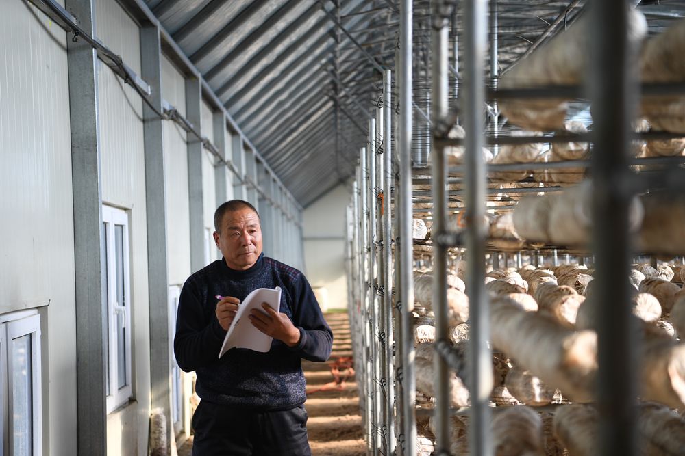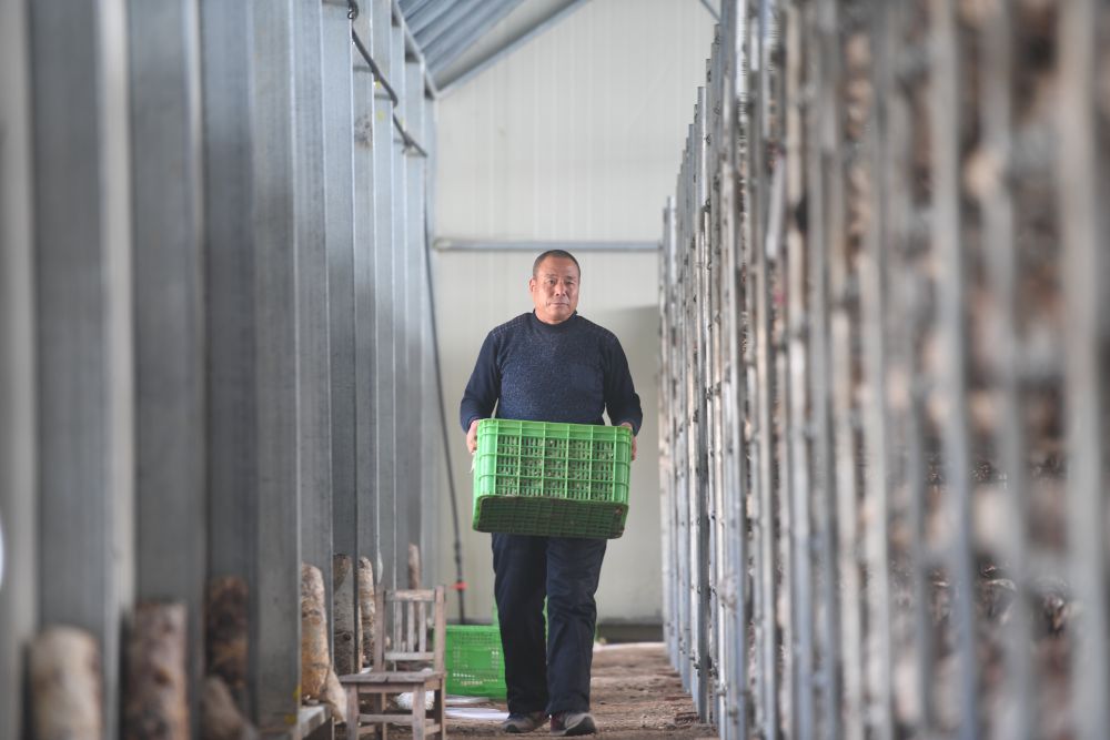 河北省阜平县黄连峪村脱贫户杜玉明在北果园食用菌基地劳作(11月25日摄)。新华社记者 朱旭东 摄