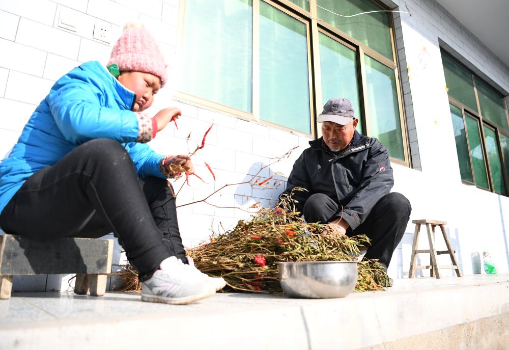 河北省阜平县东城铺村建档立卡贫困户刘国旗(右)在家中摘辣椒(11月25日摄)。新华社记者 朱旭东 摄