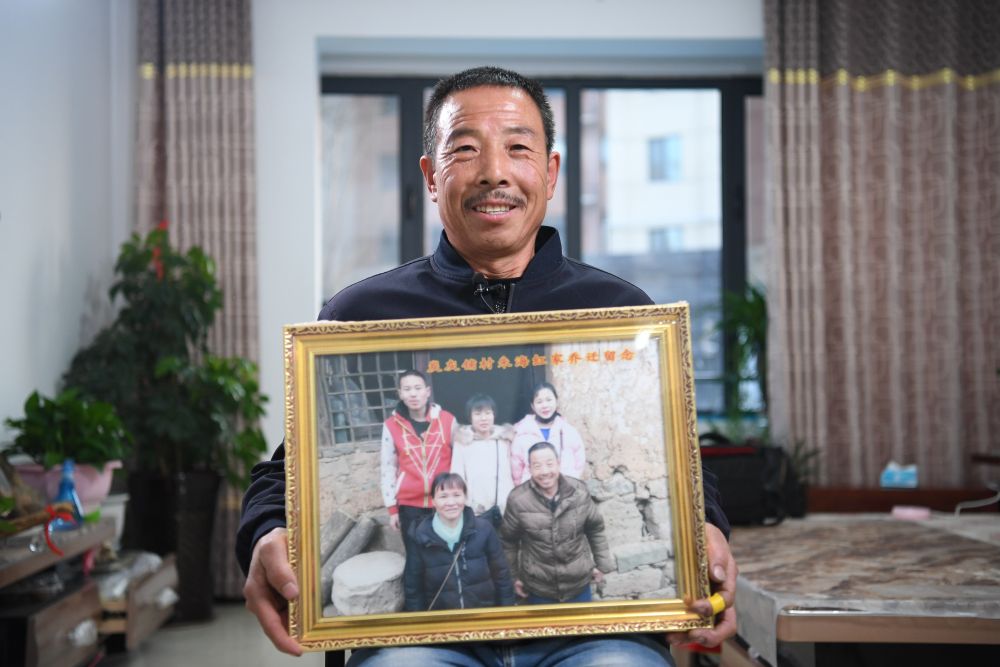 河北省阜平县易地扶贫搬迁户朱海红在安居家园集中搬迁安置小区家中展示旧居乔迁留念(11月24日摄)。新华社记者 朱旭东 摄
