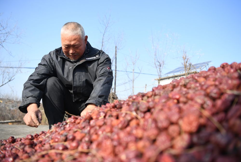 河北省阜平县东城铺村建档立卡贫困户刘国旗在家中挑拣晾晒的大枣(11月25日摄)。新华社记者 朱旭东 摄