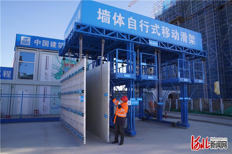 图为工作人员在展示墙体自行式移动滑架。