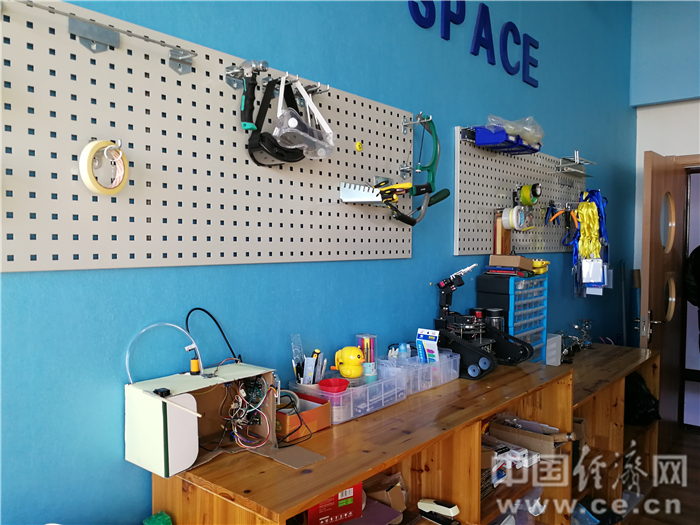 走进教学楼,大厅墙上展示着学生的书法和绘画作品,三楼走廊设置有展台,摆放着学生们的木工作品,随后记者来到学校的“人工智能实验室”,教室里陈列着学生自己设计制作的3D打印作品和各种科技手工作品。