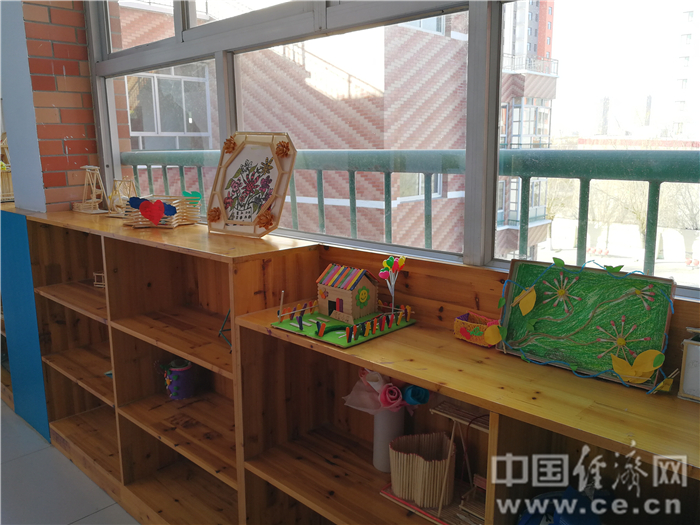 走廊展示台陈列着学生的木工作品。经济日报-中国经济网记者 石兰摄