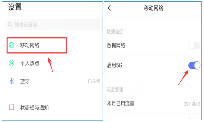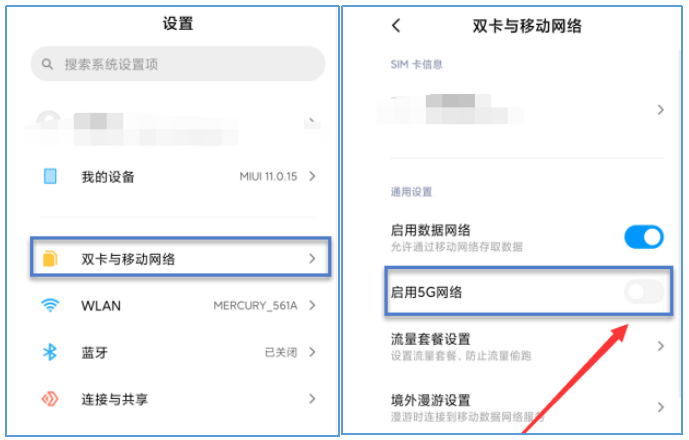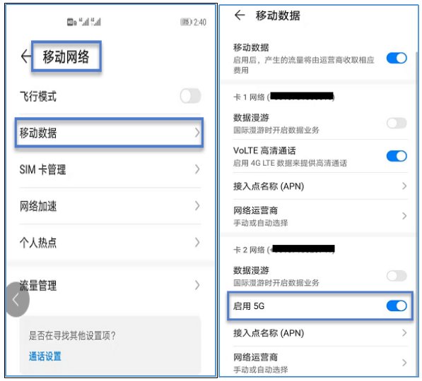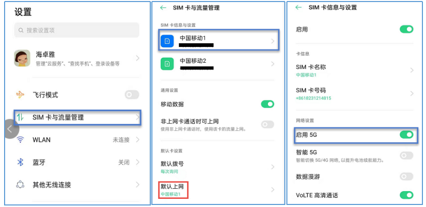 (1)设置-SIM卡与流量管理-选择默认上网卡(卡1或卡2)-启用5G