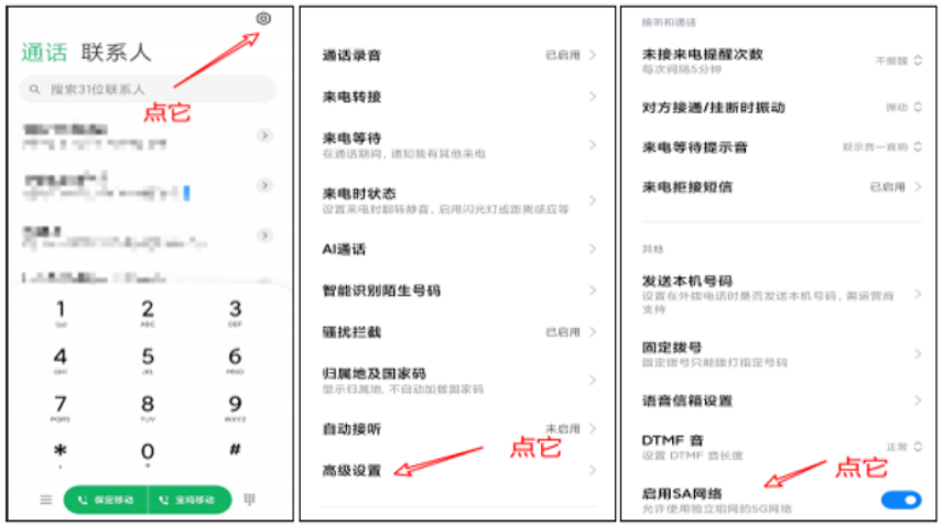 第二步,设置SA模式:打开拨号界面-选择右上角设置-高级设置,下拉至底部-启用SA网络