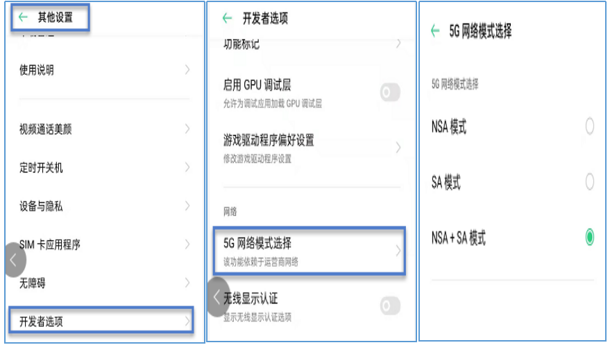 (3)设置-其他设置-开发者选项-5G网络模式选择-选择SA+NSA