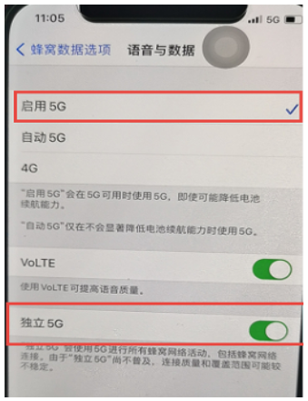 开启5G:设置-蜂窝网络-蜂窝数据选项-语音与数据-启用5G,同时打开独立5G