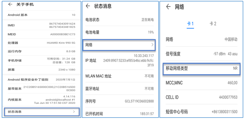 设置-关于手机-状态消息-网络-移动网络类型:NR为SA,(LTE;NR)为NSA