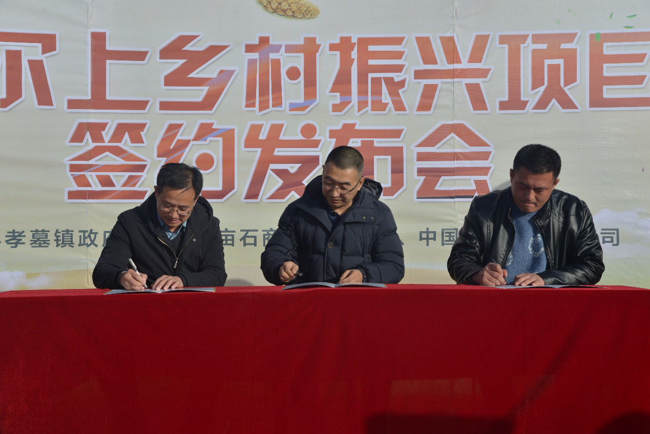 曲阳县孝墓镇镇长孙朋飞、中国电信保定分公司副总经理谢亚宁、河北一亩石商贸公司总经理霍小强代表三方签署岭尔上乡村振兴项目协议。